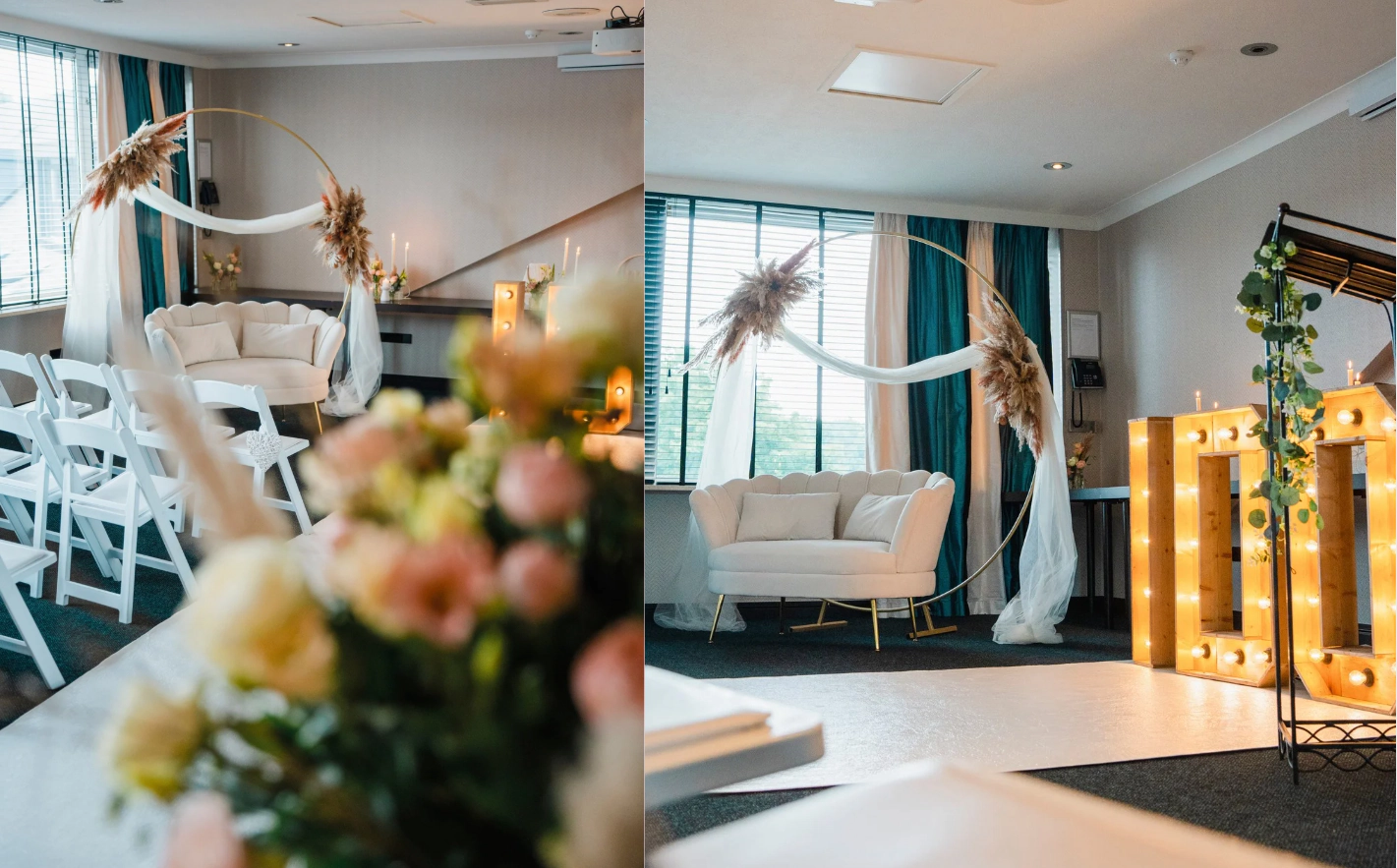 Ons hotel is een officiële trouwlocatie. Dit betekent dat jullie huwelijksplechtigheid hier kan plaatsvinden, zowel binnen in onze stijlvolle zalen als buiten in onze prachtige tuin. Zo kunnen alle belangrijke momenten van jullie dag op één locatie plaatsvinden, van de ceremonie tot het feest.