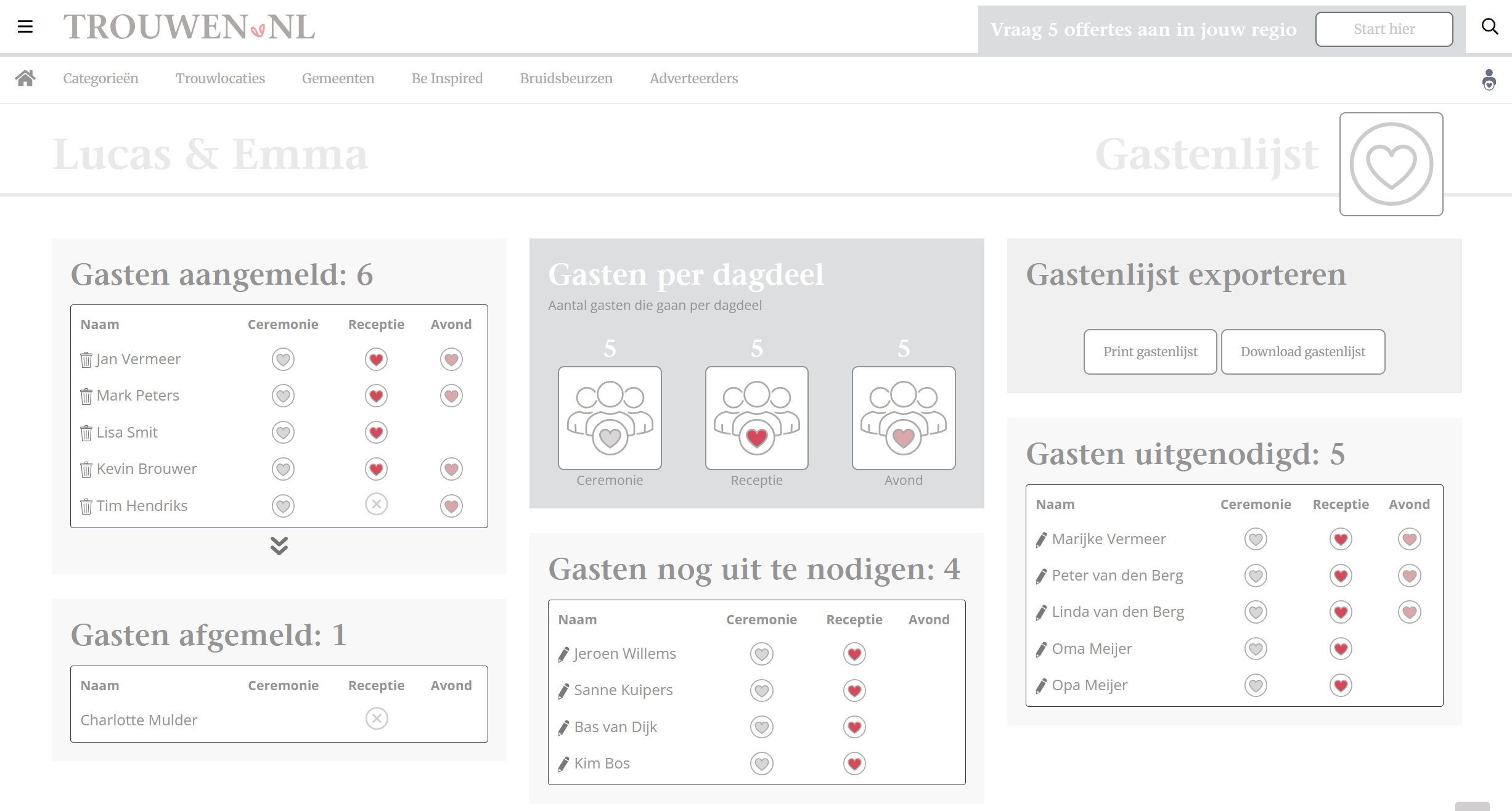 Via de gastenlijst nodig je eenvoudig mensen uit per e-mail of WhatsApp. In het overzicht zie je wie er al heeft gereageerd op de uitnodiging en hoeveel gasten naar welk onderdeel van de bruiloft komen. De gastenlijst is eenvoudig te exporteren met één druk op de knop.