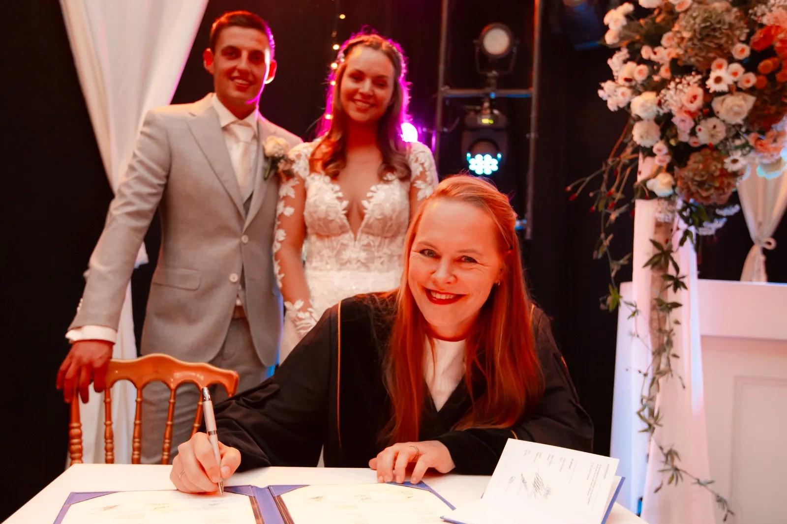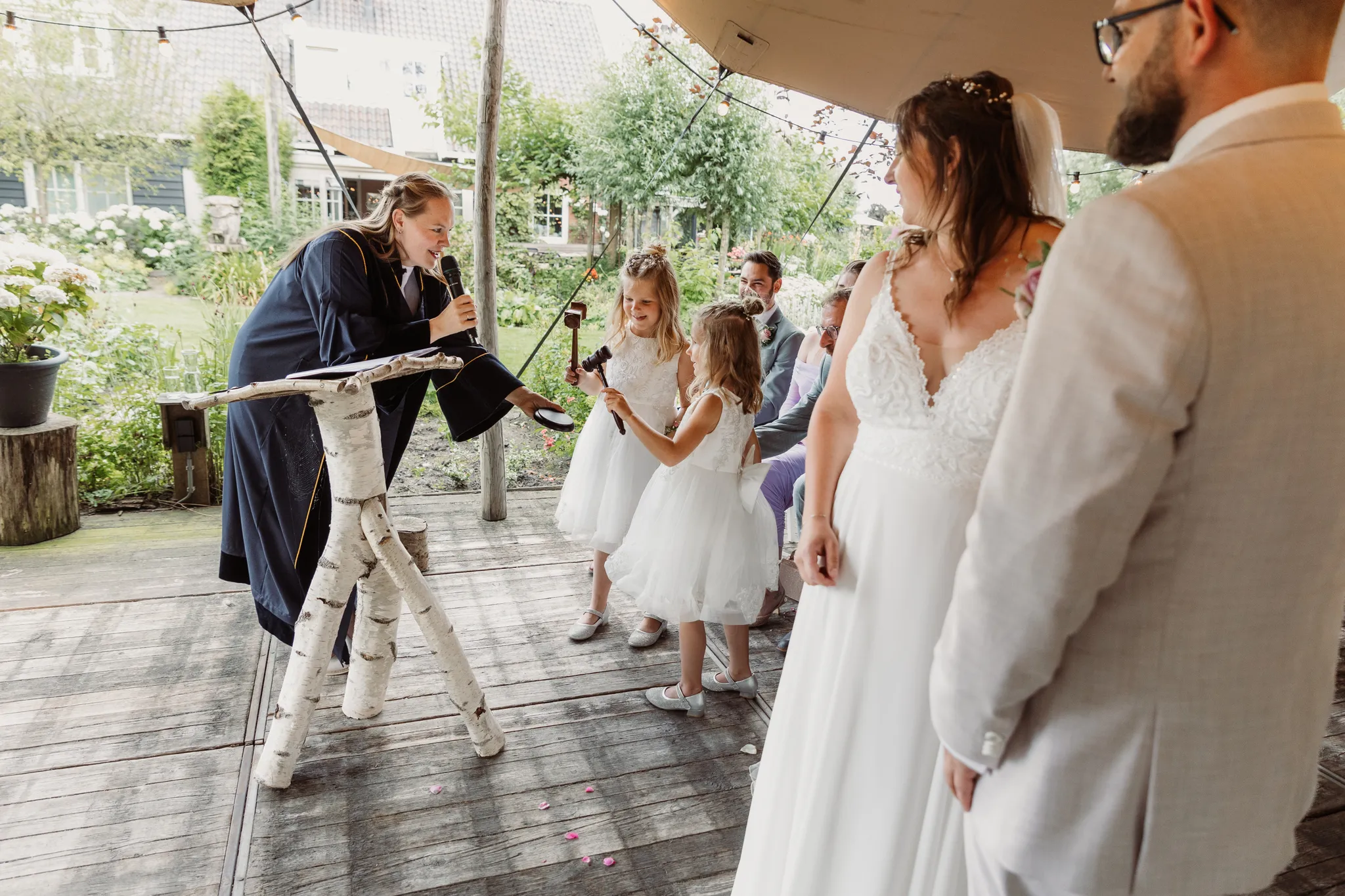 Wij hebben Dewi als onze trouwambtenaar gehad en dat was een fantastische keuze! Vanaf het eerste contact luisterde ze met volle aandacht naar ons verhaal en onze wensen. Ze toonde oprechte interesse en wist dit prachtig te verwerken in de ceremonie. Wij wilden graag een vleugje humor, en dat is haar meer dan gelukt het was persoonlijk, warm en tegelijk heerlijk luchtig. Ook aan de kinderen werd gedacht: de oudste mocht met de hamer slaan en voor hen had ze zelfs een speciale kinderakte gemaakt waar ze hun namen op konden zetten. Dat maakte het voor ons gezin extra bijzonder. Dankzij Dewi hebben wij een ceremonie gekregen die perfect bij ons pa