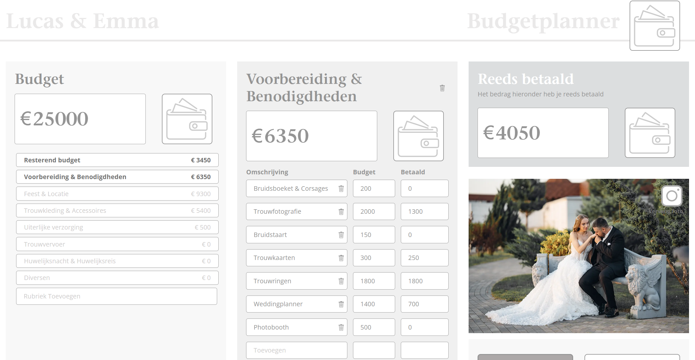 Meld je aanOp deze pagina vind je jullie budgetplanner. Eenvoudig, overzichtelijk en toch heel uitgebreid, zodat je niks vergeet! Klik onder ‘Budget’ het onderdeel aan waarvan je alle details wilt bekijken of scroll verder naar onderen voor een totaaloverzicht. Pas het totaaloverzicht naar wens aan door per blok op het prullenbak-icoon te klikken om een blok te verwijderen.