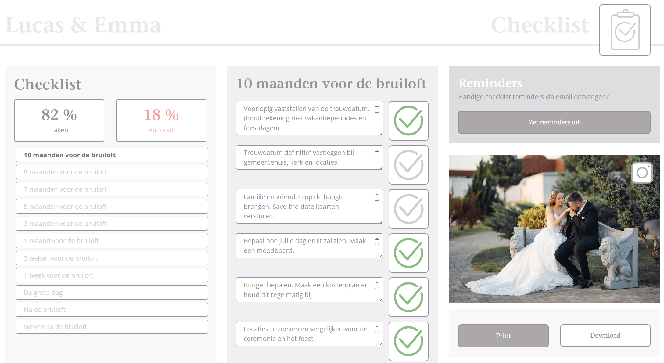 Wie houdt er nu niet van afvinken? Deze handige checklist past zich aan op jullie trouwdatum. Klik in het blok ‘Checklist’ op een onderdeel om alle details te zien. Vink elke taak eenvoudig af en behoud het overzicht. Geen tijd om de checklist te raadplegen? Zet dan de e-mail reminders voor alle taken aan. Zo mis je niks!